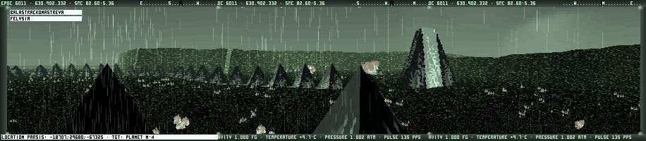 Il y a longtemps j'avais joué à Noctis, une version plus élaborée du même concept, conçu en 2000. Apparemment dans Noctis il y a 90 années lumières de terrain à explorer, avec 78 milliards d'étoiles, chacune avec leur propre système solaire fonctionnel et complet de détails. Screenshot: