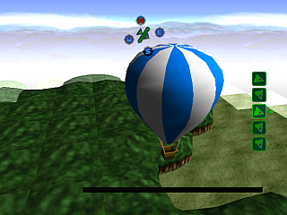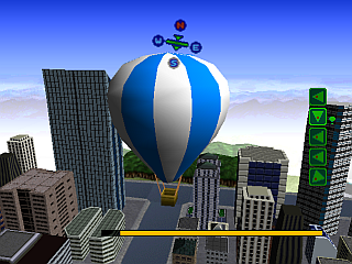 On est donc vraiment à zen town ici. On choisi sa mongolfière, on peut faire des tournois ou des activités solo... et on fait quoi en Montgolfière? Les objectifs c'est genre atterrir à un endroit précis, lancer des marqueurs au sol pour former un triangle d'une certaine grandeur, chasser d'autres mongolfières, etc. Une sorte de Pilotwings sauce Playstation 1. Il n'y a pas une tonne de choses à faire et il y a quoi, 4 décors à explorer (ils sont assez grands et funs, quand même, t'as même une ville en ruines, quel est le lore derrière ce jeu?) mais ça m'a plu.