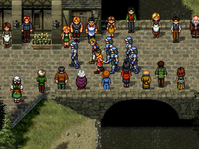 Mais donc, le premier Suikoden, on dirait un peu des gens en train d'apprendre à faire leur premier J-RPG ! Ce qui est pas mal d'un côté : y a des éléments qui m'ont plu, comme le level up qui s'assure très fort que tu n'auras jamais à faire de farming, l'absence de potions de résurrection (ton personnage est juste KO pendant le combat, hors combat tu lui donnes une potion ordinaire et ça va). Mais d'un autre, ça feel pas vraiment comme un J-RPG de 1995, plutôt 1993, l'histoire est très de base... mais c'est un peu la faute à cette idée d'avoir environ 110 personnages jouables, on a pas trop l'occasion de creuser la personnalité de chacun d'entre eux. Suikoden c'est vraiment comme jouer avec sa collection de figurines, c'est rigolo de les collectionner et les sprites sont tous très beaux. Ça fait 25 ans que je trouve les sprites de Suikoden jolis, mais je comprends maintenant que leur taille a un prix : les décors doivent aussi être grands et ils sont donc assez inintéressants dans le 320*240 de l'écran, on a droit à de la texture de sol et c'est tout assez souvent. Mais le mapping est assez mauvais aussi, les lieux ne sont jamais intéressants. Le pire ce sont les donjons, des labyrinthes où il y a le bon chemin, et le chemin qui fait juste 3 cases plus loin que l'écran pour mener à un coffre. Pour vrai, j'ai sorti de beaux screenshots en haut, mais 90% du jeu ressemble à ça je crois: