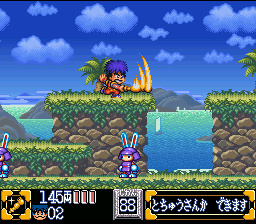 En amérique, on a seulement eu le premier Goemon au Super Nintendo, il a fallu ensuite attendre la N64 pour avoir d'autres jeux de la série, et c'est dommage, Goemon c'est vraiment qualité et Goemon 2 est un jeu assez différent du premier, qui ajoute des éléments Super Mario World-esque au tout et des délires de mechas qui varient le gameplay sans échouer avec des mini-jeux chiants. Ce que j'ai surtout aimé, c'est l'antagoniste, cet espèce d'américain/européen blond mauvais otaku qui est vraiment la parodie la plus méchante et stéréotypée qu'on peut faire d'un américain/européen (il s'appelle McGuiness, il serait irlandais donc?), c'est super.